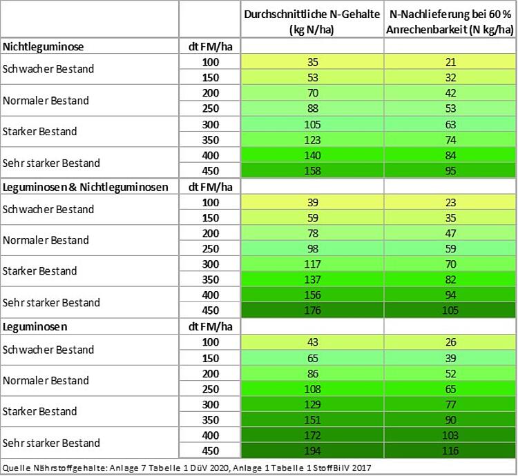 Gut entwickelte Zwischenfruchtbestände haben bereits jetzt einen Frischmasseaufwuchs von mehr als 200 dt FM/ha und die Vegetationsperiode ist noch nicht zu Ende. Abhängig vom Leguminosengehalt in der Mischung lassen sich die durchschnittlichen N-Gehalte der Zwischenfrüchte ermitteln (siehe Tabelle). Die Kalkulation basiert auf Richtwerten aus Anlage 7 Tabelle 1 DüV 2020 und Anlage 1 Tabelle 1 StoffBilV 2017, welche durch eigene Praxiserfahrungen bestätigt wurden. Etwa 60 % des N-Gehalts in der Biomasse kann für die Folgekultur angerechnet werden.