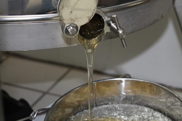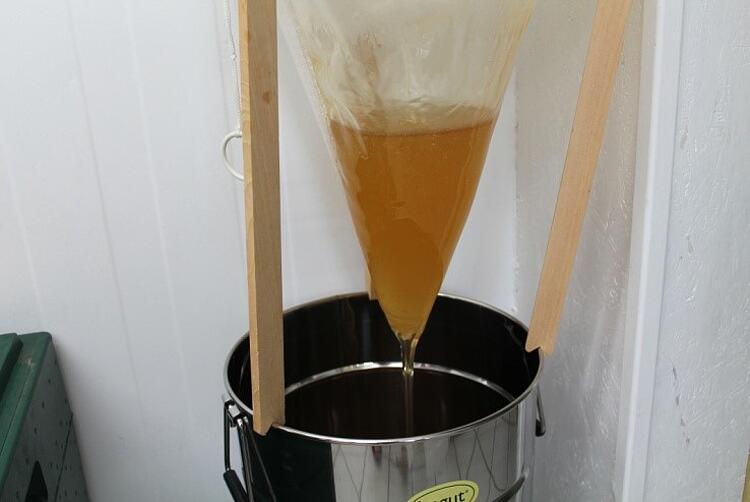 Im Schleuderraum waren 25-28° C, denn bei Wärme fließt der Honig besser. Der Honig läuft aus der Schleuder durch ein grobes, ein feines Sieb und ein noch feineres Spitzsieb in die jeweiligen Lagerbehälter. So werden auch kleinste Wachsteilchen zurückgehalten.