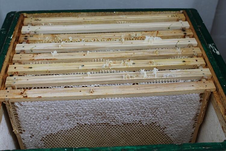 In einem Honigraum können bis zu 20 kg Honig eingelagert werden. Die Bienen trocknen den Honig, indem sie am Flugloch aufgereiht mit den Flügeln schlagen und so den Bau mit warmer Luft „durchfönen“.