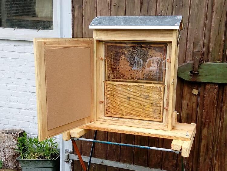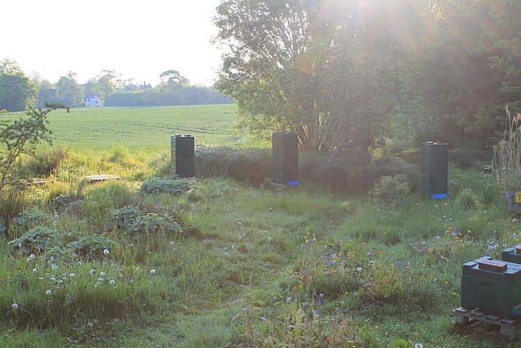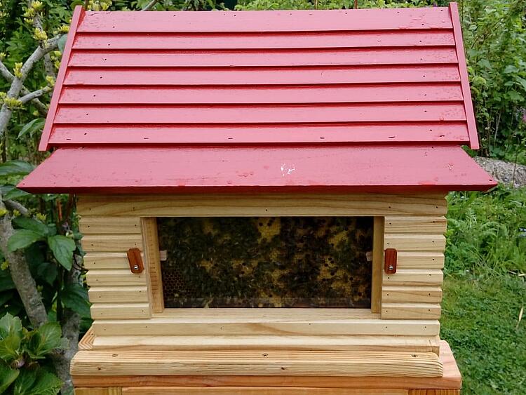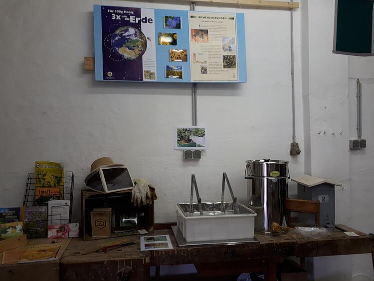 Im Garten stand ein Wirtschaftsvolk mit zwei Honigräumen und zwei kleine Völker in Schaukästen. Hier konnte man die Bienen bestens beobachten: die Arbeiterinnen, die Drohnen und die Königin. Ebenso aus nächster Nähe Waben mit Honig, mit Pollen und mit Brut in den verschiedenen Stadien.
