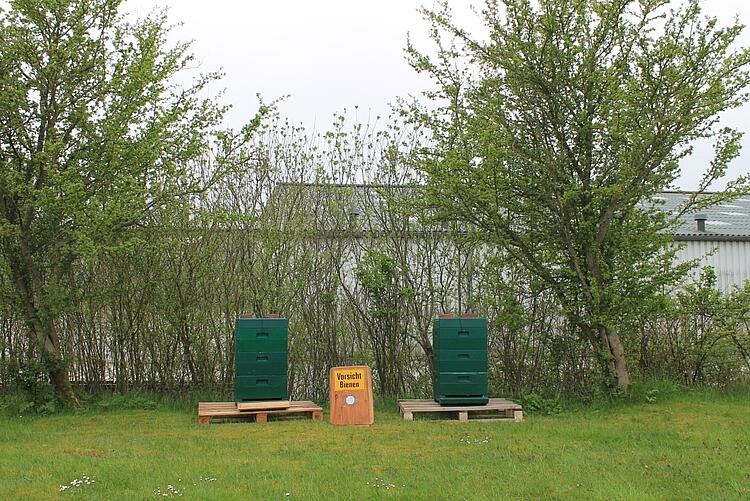 Der neue Standort soll für die Rapshonigernte in Grundhof auf dem Lundsgaarder Hof sein. 5-6 Wochen, solange der Raps blüht, bleiben sie dort stehen. Zwei Paletten wurden in Waage und die Bienenbeuten darauf gestellt. Jedes Volk bekommt noch einen Honigraum aufgesetzt, hier wird nun der Rapshonig eingetragen. Ein Schild „Vorsicht Bienen“ und Name, Adresse und Telefonnummer des Imkers gehören ebenfalls an den neuen Standort.