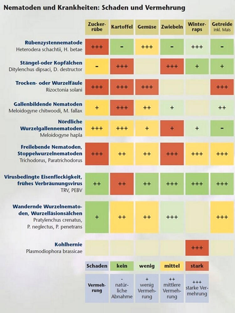 Sorten mit höherer Resistenz (Resistenznote 1) ermöglichen einen höheren Wirkungsgrad in der Nematodenbekämpfung. Außerdem unterstützen eine zügige Anfangsentwicklung und verzögerte Blühneigung mit schnellem und intensivem Wurzelwachstum die erfolgreiche Bekämpfung.Eine wirkungsvolle Unkrautunterdrückung ist auch wichtig für die Bekämpfung von freilebenden und gallenbildenden Nematoden, da diese sich an vielen Unkräutern vermehren können.
