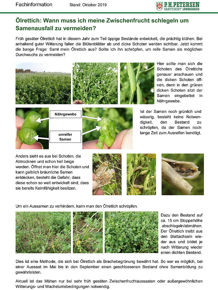 Um ein Aussamen zu verhindern, kann man den Ölrettich schröpfen. Dazu den Bestand auf ca. 15 cm Stoppelhöhe abschlegeln/abmähen. Der Ölrettich treibt aus den Blattachseln wieder aus und bildet je nach Witterung wieder einen dichten Bestand. Dies ist eine Methode, die sich bei Ölrettich als Brachebegrünung bewährt hat.