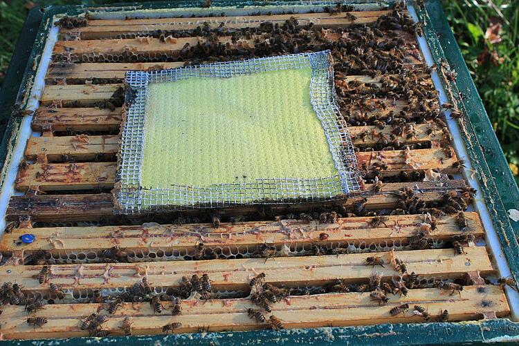 So konnte ich im September zwei Behandlungen durchführen. Hierfür lege ich ein Schwammtuch auf die Rähmchen im oberen Kasten und gebe darauf 44 ml Ameisensäure. Zusätzlich wird der Boden des Bienenstocks mit einem Bodenschieber verschlossen.