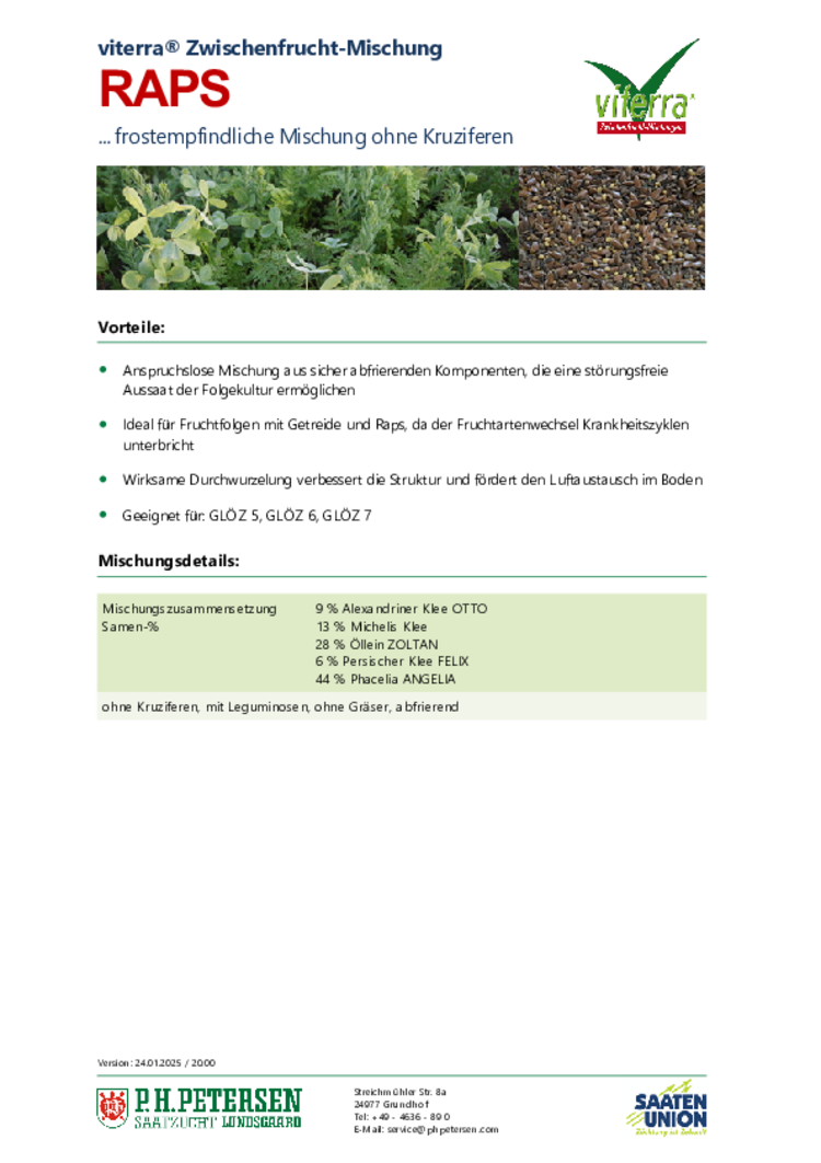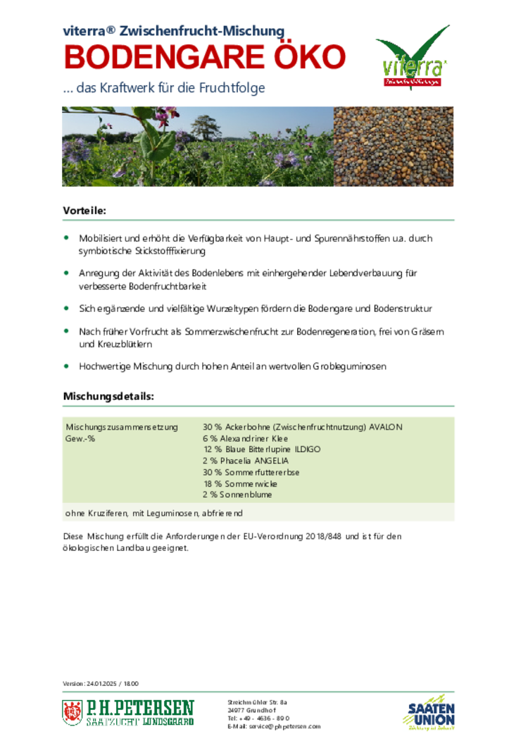 Zu jeder Sorte oder Zwischenfrucht-Mischung innerhalb des Menüs Produkte stellen wir Ihnen ein pdf-Dokument mit den Eigenschaften zum Download zur Verfügung. Eine Auflistung aller Sorten und Mischungen finden Sie weiter unten.