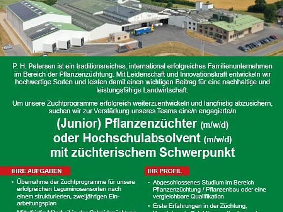 P.H. Petersen hat die weltweit ersten nematodenresistenten Sorten entwickelt und setzt kontinuierlich auf fortschrittliche Züchtungstechnologien. Mit über 40 verschiedenen Kulturarten können wir eine breite Palette an Lösungen für nachhaltige und vielfältige Fruchtfolgen anbieten; unsere modernen Reinigungs- und Aufbereitungsanlagen sowie betriebseigenen Labore garantieren höchste Saatgutqualität und zuverlässige Erträge.