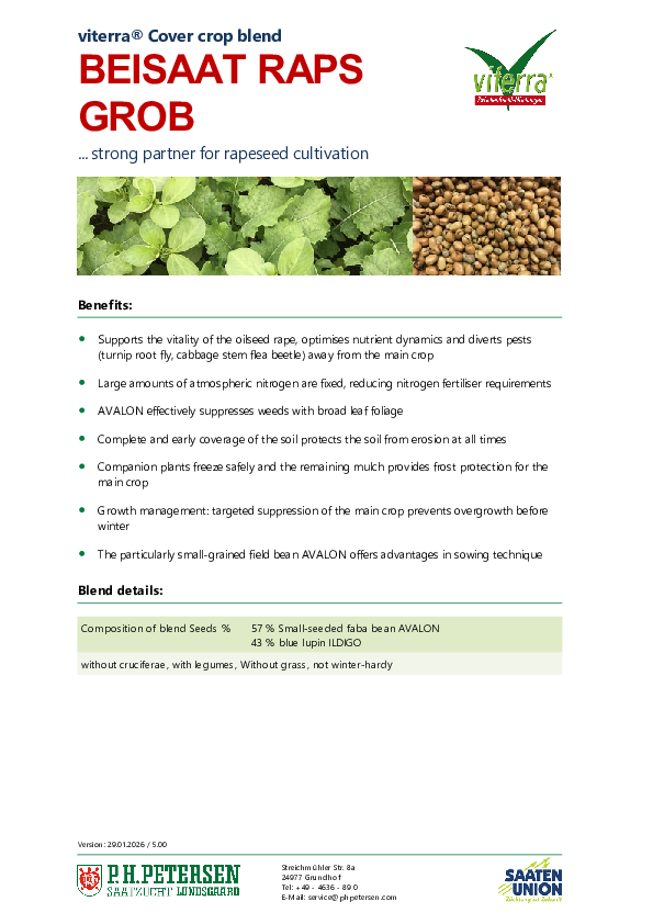 | Sowing period | Together with rapeseed sowing (two-tank system) or shortly before |