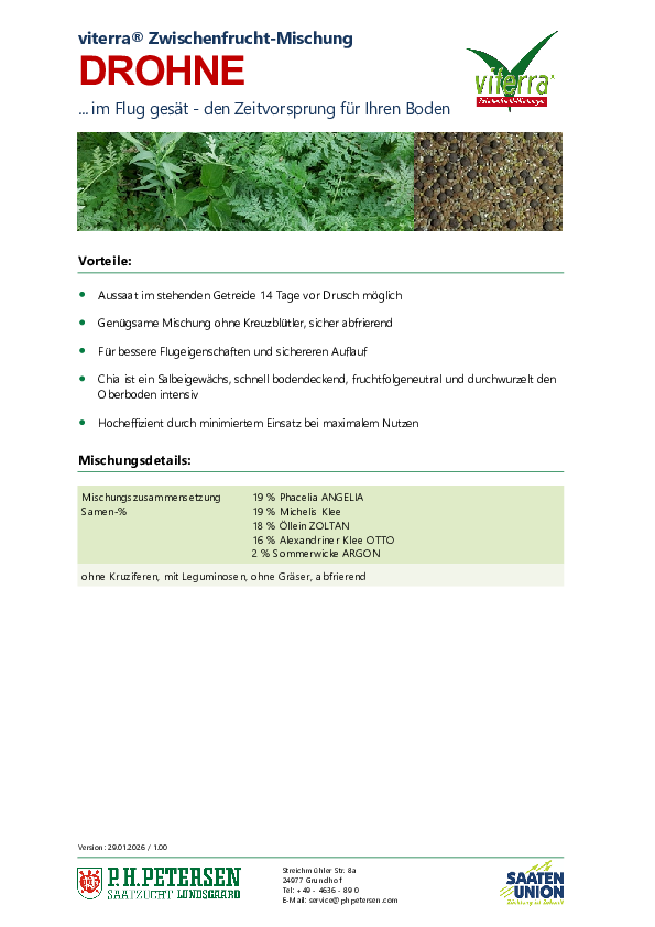 | Samen-% : | 19 % Michelis Klee 19 % Phacelia ANGELIA 18 % Öllein ZOLTAN 16 % Alexandriner Klee OTTO 2 % Sommerwicke ARGON |