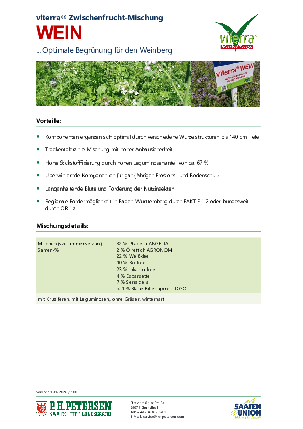| Samen-% : | 32 % Phacelia ANGELIA 23 % Inkarnatklee 22 % Weißklee 10 % Rotklee 7 % Serradella 4 % Esparsette 2 % Ölrettich AGRONOM |